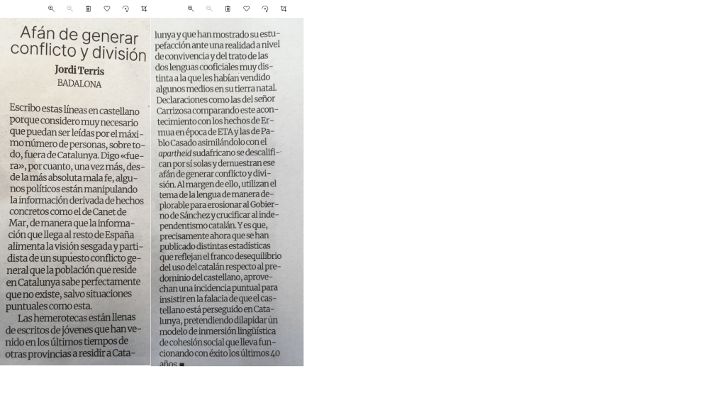 Declaraciones como las del Sr. Carrizosa comparando este acontecimiento con los hechos de Ermua en época de ETA y las del Sr. Pablo Casado asimilándolo con el apartheid sudafricano, cuyos dirigentes, por cierto representan a partidos muy minoritarios en Catalunya, se descalifican por si solas y demuestran ese afán de generar conflicto y división. Al margen de ello, utilizan el tema de la lengua de manera deplorable para erosionar el gobierno de Sánchez y para crucificar al independentismo catalán.