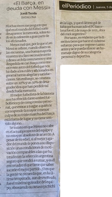 Se insiste en que Messi no cabe en el actual proyecto del equipo; no estoy en absoluto de acuerdo. A pesar de su edad, si al mejor jugador del mundo le pones a su disposición unas condiciones de motivación comparables a las que ha tenido con la selección argentina, seguro que vendrá a sumar y es el entrenador el que tiene que saber sacarle el mejor partido. O es que, por poner algún ejemplo,  la gente no recuerda  que en la última temporada “desmotivado” fue el máximo goleador del equipo, obteniendo su octavo pichichi en la liga, y que el último gol de falta que ha marcado el FC Barcelona fue el 2 de mayo de 2021, obra del crack argentino.