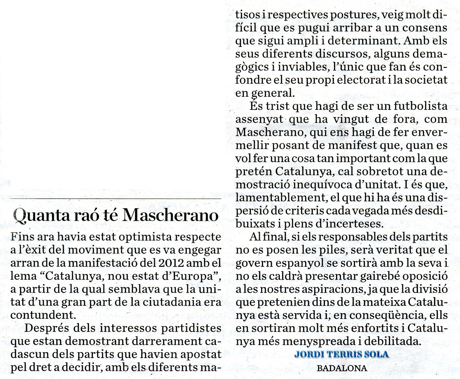 És trist que hagi de ser un futbolista assenyat que ha vingut de fora, com és Mascherano, qui ens hagi de treure els colors posant de manifest que quan es vol fer quelcom tan important com pretén Catalunya, cal sobretot una demostració inequívoca d’unitat. I és que, lamentablement, el que hi ha és una dispersió de criteris cada vegada més desdibuixats i plens d’incerteses.