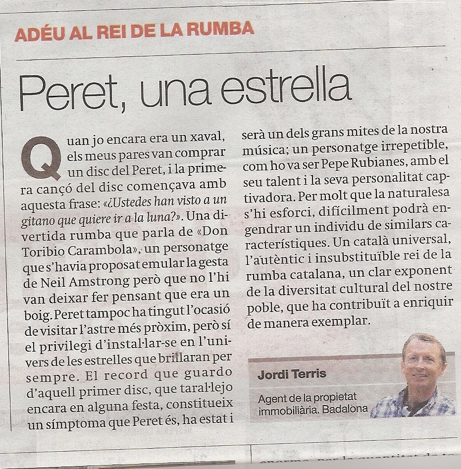 El record que sempre guardo d’aquell primer disc, i que taral·lejo encara en alguna que altra gresca, de la mateixa manera que preservo la cançó dels Beatles “Love me do”, constitueix un símptoma evident que Peret és, ha estat i serà un dels grans mites de la nostra música; un personatge irrepetible que, com Pepe Rubianes, amb el seu talent i la seva personalitat captivadora, per molt que la naturalesa s’esmerci, difícilment podrà engendrar un individu de similars característiques. Un català universal, l’autèntic i insubstituïble rei la rumba catalana que ha representat un clar exponent de la diversitat cultural del nostre poble i que ha contribuït a enriquir-la de manera exemplar.