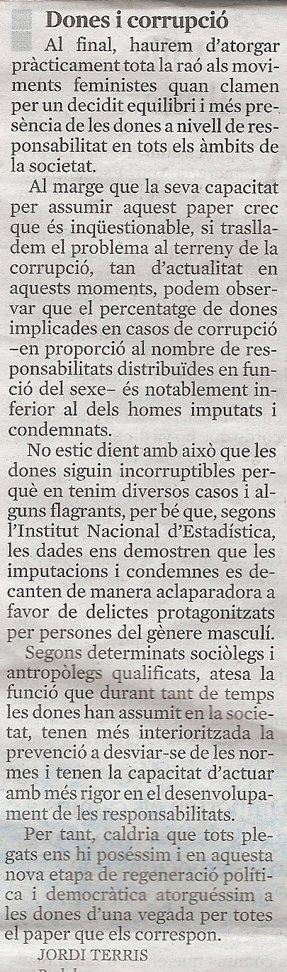No estic dient amb això que les dones siguin incorruptibles, per bé que les estadístiques ens demostren que les imputacions i condemnes es decanten de manera aclaparadora a favor de delictes protagonitzats per persones del gènere masculí. Exemples recents els tenim en el cas Pujol on les filles del suposat “clan” pràcticament estan exemptes dels delictes que s’imputen als seus germans.
