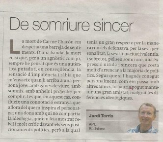 La mort de Carme Chacón em desperta una barreja de sentiments. D’un banda, la pròpia mort en sí que, per un agnòstic com jo, sempre he pensat que és una autèntica putada, i en conseqüència, la sensació d’impotència i ràbia que m’envaeix quan li arriba a una persona jove amb ganes de viure, amb somnis, amb anhels, il·lusions i projectes per acomplir, tot plegat esberlat de soca-rel, sense avisar.