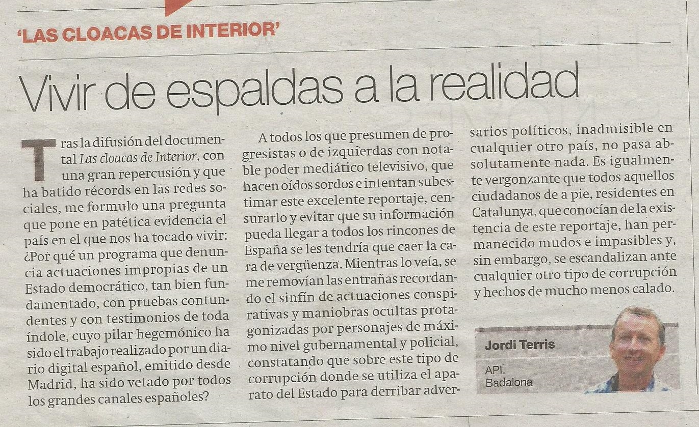 Tras la difusión del programa titulado “Las Cloacas de Interior” elaborado por la productora Mediapro y emitido este pasado martes 18-07 por Tv3 y por IB3 para Baleares que ha tenido una gran repercusión y que batió records ese día en las redes sociales, ante todo me formulo una pregunta que pone en patética evidencia el país donde nos ha tocado crecer y desarrollarnos socialmente: ¿Por qué un programa que denuncia actuaciones deleznables, impropias de un Estado democrático, tan elocuente, tan bien fundamentado, con pruebas contundentes y con testimonios de toda índole a nivel político, periodístico y policial, cuyo pilar hegemónico ha sido el trabajo realizado un diario digital español, emitido desde Madrid, ha sido vetado por todos los grandes canales españoles?