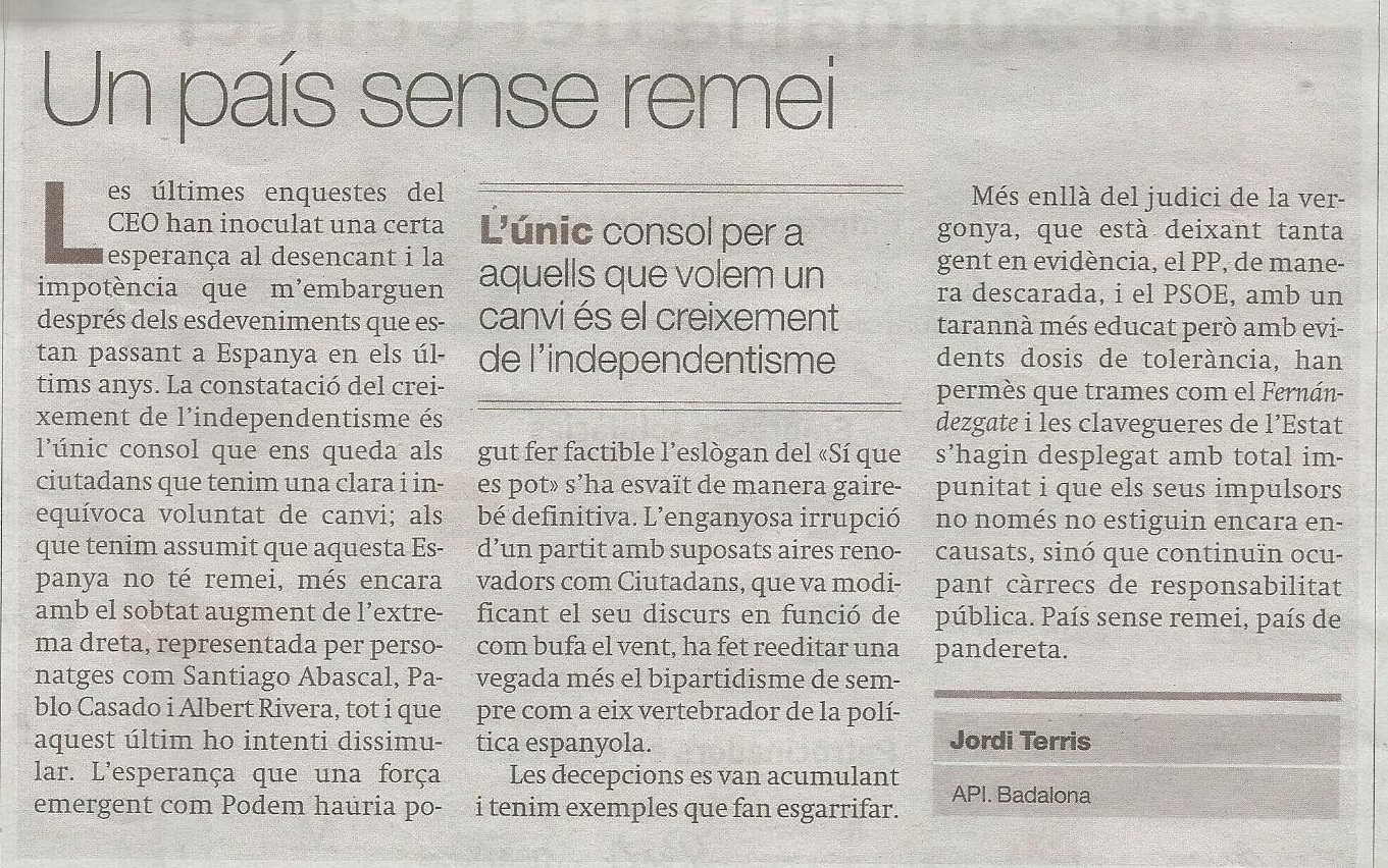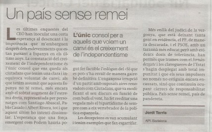 Davant la constatació del creixement de l’independentisme, és l´ùnic consol que ens queda a aquells ciutadans que tenim la clara i inequívoca voluntat de canvi; per als que tenim absolutament coll avall que aquesta Espanya no té remei, més encara amb el sobtat augment de l’extrema dreta, representada per personatges com Abascal, Casado o Ribera, encara que aquest últim ho intenti dissimular.