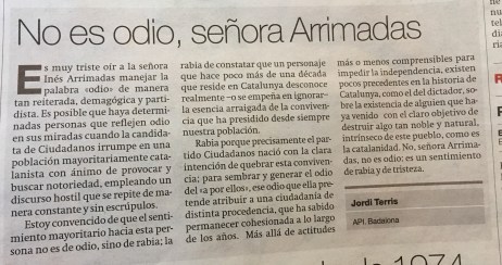 Estoy convencido que el sentimiento mayoritario hacia esta persona no es de odio, sino de rabia; rabia de constatar que un personaje que hace poco más de una década que reside en Catalunya, que desconoce realmente, o se empeña en ignorar, la esencia arraigada de la convivencia que ha presidido desde siempre entre nuestra población. Rabia porque precisamente el partido Ciudadanos nació con la clara intención de quebrar esta convivencia; para sembrar y generar el odio del «a por ellos», ese odio que ella pretende atribuir a una ciudadanía de distinta procedencia, que ha sabido permanecer cohesionada a lo largo de los años.