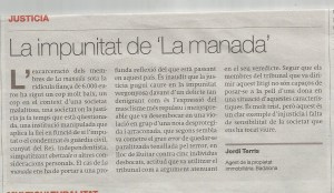 El cas de la Manada ens ha de dur a la profunda reflexió del que està passant en aquest país. És inaudit que la justicia pugui caure en la impunitat vergonyosa davant un delicte tan denigrant com és l’expressió del masclisme més repulsiu i menyspreable que va desembocar en una violació en grup d’una noia desprotegida i arraconada, la qual segons sembla, va cometre el «gran error» de quedar-se paralitzada tenallada pel terror, en lloc de tornar-se histèrica i lluitar contra cinc individus desbocats, actitud que va utilitzar el tribunal com argument atenuant en el seu veredicte.