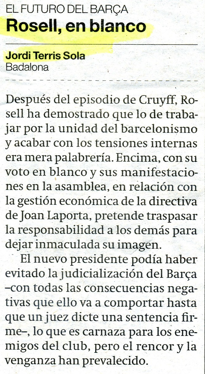 Después del episodio con Johan Cruiyff de protagonista, Rosell ha demostrado que lo de trabajar por la unidad del barcelonismo y acabar con los ismos era mera palabreria y, encima, con su voto en blanco y sus manifestaciones en la Asamblea, ha pretendido traspasar la responsabilidad a los demás el hecho de llevar a la anterior junta a los tribunales para dejar inmaculada su imagen de “niño bueno”.